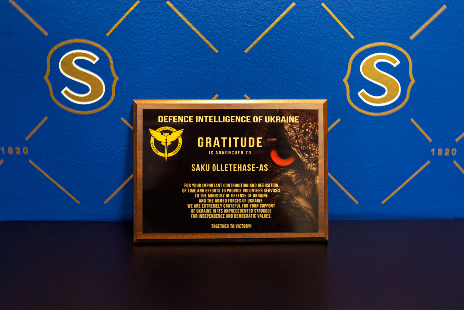 Saku Õlletehas pälvis tunnustuse Ukraina kaitseministeeriumi luure peadirektoraadilt (HUR) koostöös MTÜ-ga SAB UA Ukraina kaitsjatele saadetud abi eest.
