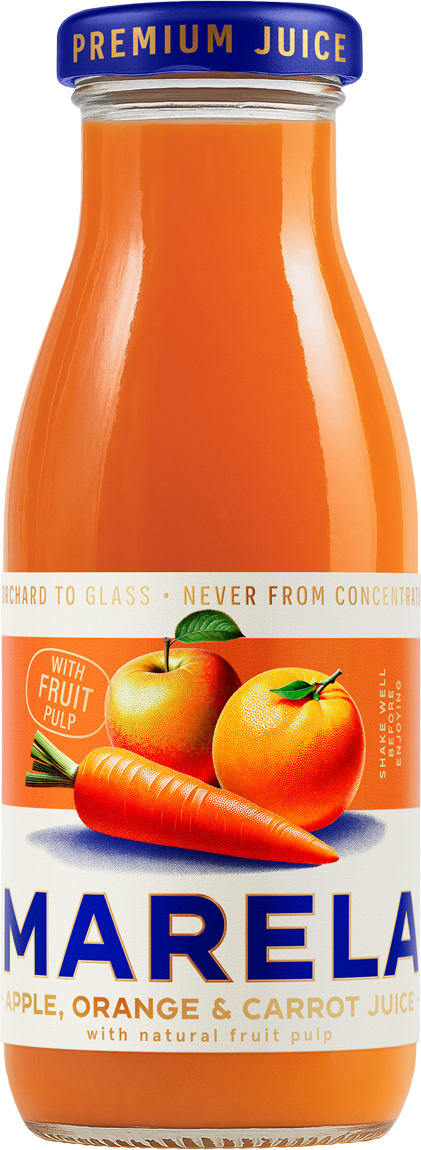 Marela õuna-, apelsini- ja porgandimahl ühendab endas kolme hoolikalt valitud koostisosa harmoonilise maitse ning sisaldab naturaalset viljaliha. Valmistatud mitte kontsentraadist ja pastöriseeritud, et tagada kvaliteet ning värskus igas pakendis. Tasakaalustatud retsept loob meeldivalt mahlase ja kergelt täidlase tekstuuri, mis sobib hästi nii hommikuseks kosutuseks kui päeva jooksul värskenduseks. Marela – puhas maitse ja kvaliteet igas lonksus.